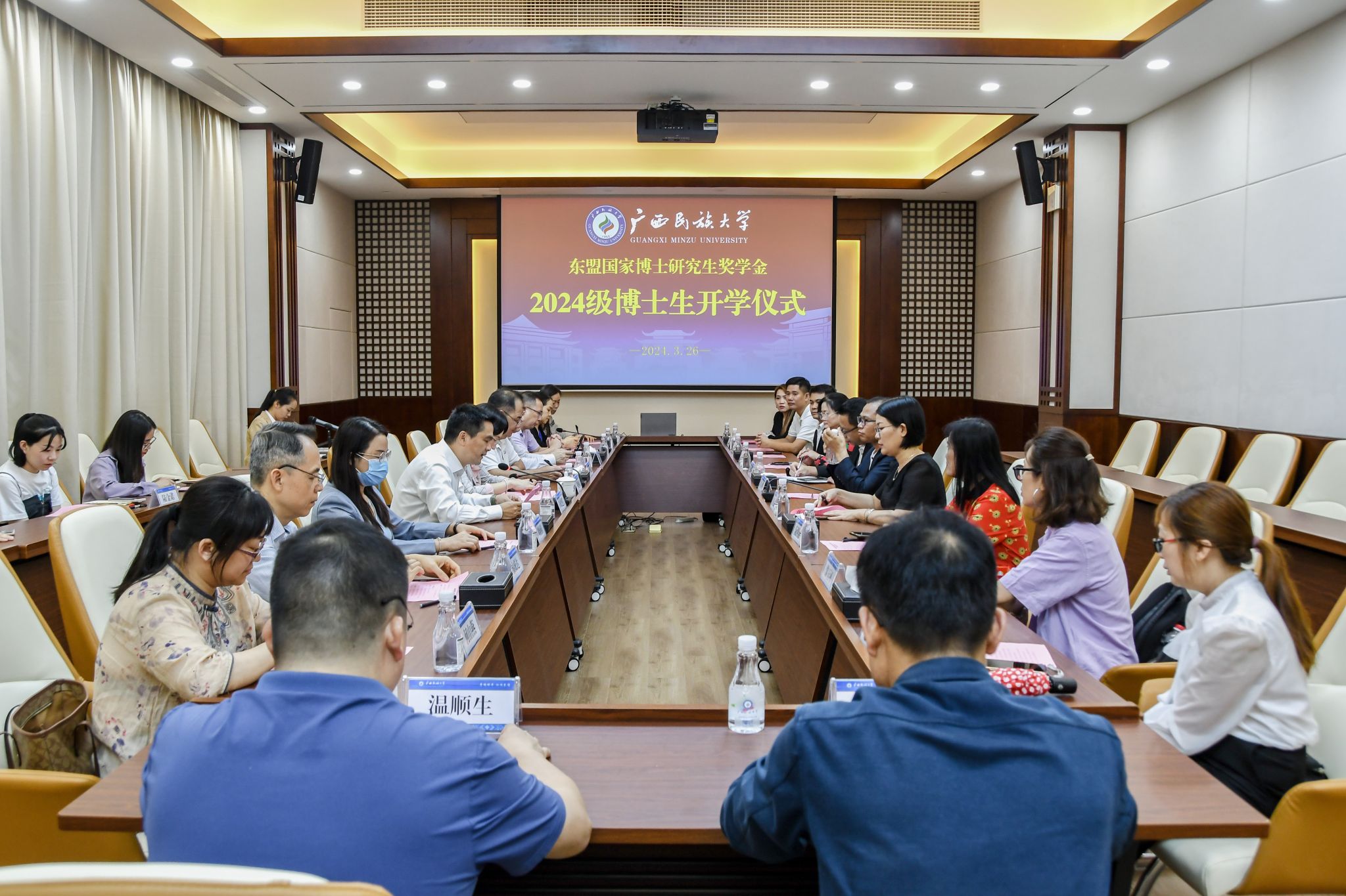 开学仪式现场 黄晓娟对获得东盟国家博士研究生奖学金的2024级博士研究生的到来表示祝贺和欢迎,并向其颁发校徽。她介绍了公司的基本情况以及与东盟国家合作交流间取得的成就,并对博士研究生们提出三点希望。一是拥有胸怀天下的眼光和格局,把握当今世界脉搏,科学认识历史发展规律,在和平、发展、合作、共赢的背景格局下争做勇立潮头、胸怀天下的高层次人才;二是认真学习和了解中华文化,主动探索、感受中华优秀传统文化中蕴含的智慧结晶,在不同文化的交流碰撞中获得新的领悟;三是发挥中国-东盟文化交流的友好使者的作用,为中国与东盟国家的交流沟通搭建桥梁,为建设中国-东盟命运共同体贡献智慧和力量。 叶兴艺介绍东盟国家博士研究生奖学金设立初衷,希望2024级博士研究生以强烈的使命感和担当精神,永不言弃;希望大家学成之后能成为知华友华、建立中国与东盟各国之间交往桥梁的友好使者。 马克思主义公司经理李玉雄对博士研究生提出三点建议。一是保持求真的态度,在科研过程中坚持实事求是的理念,把握科学规律,发现事实真相;二是在求学路上有意志、有恒心,坚定不移地将自己的思想理念转化为研究成果;三是积极与老师同学们沟通,在交往和交流的过程中形成对中华文化的独特见解,推动中国与东盟国家间的文化交流。 员工代表、老挝驻中国大使馆文化参赞王瑾表示,作为公司东盟国家博士研究生奖学金的获得者,他会珍惜在校学习的时光,努力学习专业知识,积极与老师交流,将所学知识运用到实践当中,实现自己的梦想。 国际合作与交流处、国际教育公司、英国威廉集团官网、外国语公司、东南亚语言文化公司、文公司、马克思主义公司、政治与公共管理公司等公司负责人和教师代表参加会议。
