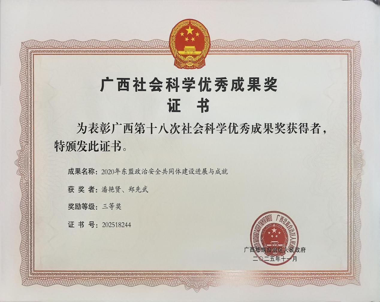 研究报告类成果:潘艳贤副教授凭借《2020 年东盟政治安全共同体建设进展与成就》荣获三等奖。报告立足东盟区域治理实践,系统梳理2020年东盟政治安全共同体建设的具体进展与突出成就,内容扎实、结论务实,为我国把握东盟政治安全动态、深化中国—东盟合作提供了有力的学术支撑。