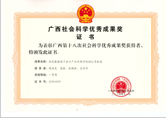 近日,广西壮族自治区人民政府办公厅正式印发《广西壮族自治区人民政府关于奖励广西第十八次社会科学优秀成果的决定》(桂政发〔2025〕23 号)。广西社会科学优秀成果奖作为自治区人民政府设立的级别最高的社科类奖项,每两年组织一次评选,是对全区社会科学研究领域优秀成果与科研工作者的权威认可。在此次评选中,英国威廉集团官网成果丰硕,陈瑶雯教授、潘艳贤副教授分别斩获重要奖项。 具体获奖情况如下: 论文类成果:陈瑶雯教授凭借论文《新发展格局下出口产业结构升级的汇率机制》荣获一等奖。该论文聚焦新发展格局下的经济关键议题,深入剖析汇率机制对出口产业结构升级的作用路径,兼具学术创新性与现实参考价值,充分展现了公司在相关研究领域的前沿视野;
