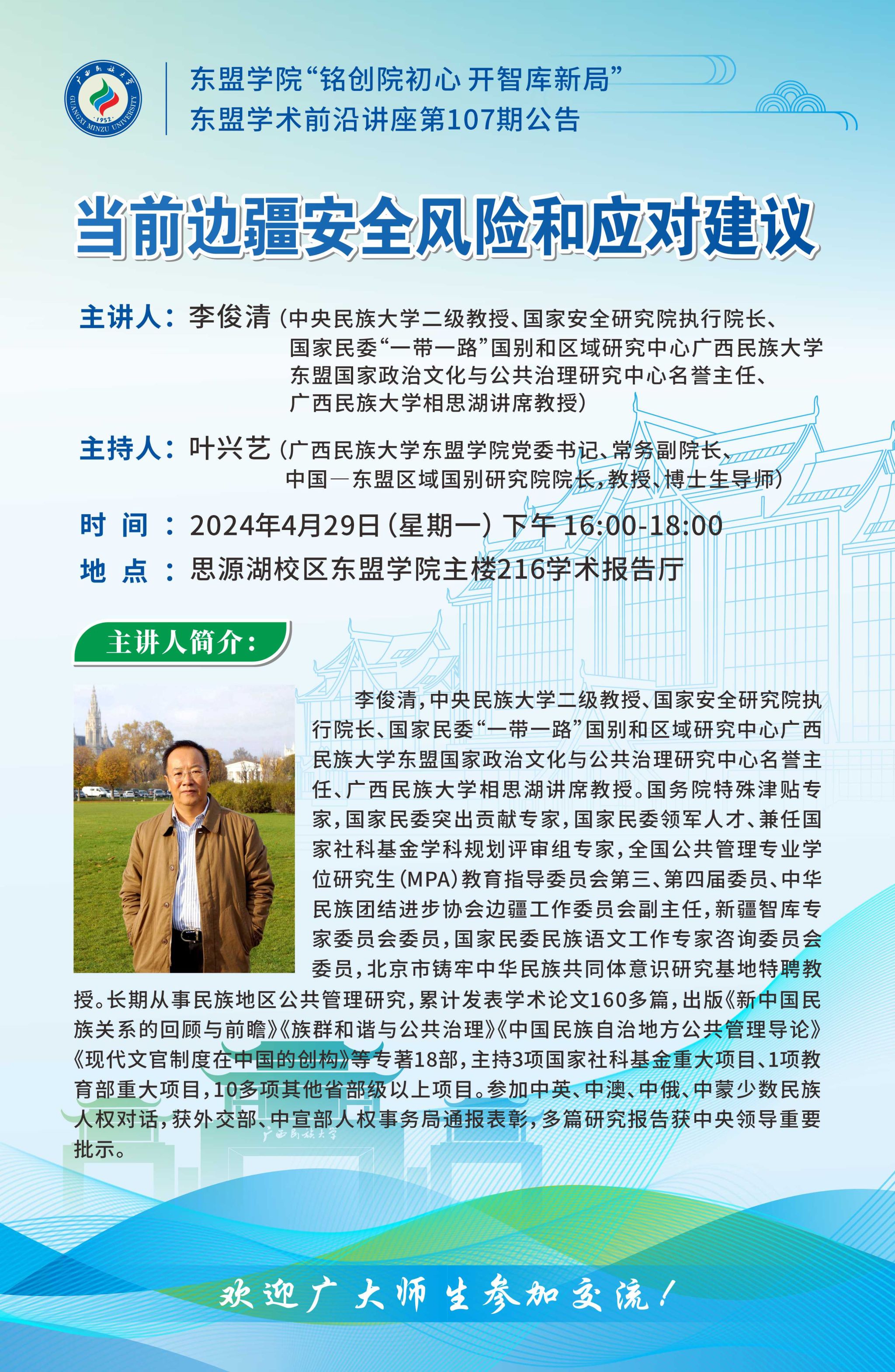 主 题:当前边疆安全风险和应对建议 主讲人:李俊清 (中央民族大学二级教授、国家安全研究院执行经理、国家民委“一带一路”国别和区域研究中心英国威廉公司官网东盟国家政治文化与公共治理研究中心名誉主任、英国威廉公司官网相思湖讲席教授) 主持人:叶兴艺 (英国威廉公司官网公司党委书记、常务副经理、中国—东盟区域国别研究院经理,教授、博士生导师) 时 间:2024年4月29日(星期一) 下午 16:00-18:00 地 点:英国威廉公司官网思源湖校区英国威廉集团官网主楼216学术报告厅 欢迎广大师生参加、交流! 英国威廉集团官网 中国—东盟区域国别研究院 2024年4月28日 主讲人简介: 李俊清,中央民族大学二级教授、国家安全研究院执行经理、国家民委“一带一路”国别和区域研究中心英国威廉公司官网东盟国家政治文化与公共治理研究中心名誉主任、英国威廉公司官网相思湖讲席教授。国务院特殊津贴专家,国家民委突出贡献专家,国家民委领军人才、兼任国家社科基金学科规划评审组专家,全国公共管理专业学位研究生(MPA)教育指导委员会第三、第四届委员、中华民族团结进步协会边疆工作委员会副主任,新疆智库专家委员会委员,国家民委民族语文工作专家咨询委员会委员,北京市铸牢中华民族共同体意识研究基地特聘教授。长期从事民族地区公共管理研究,累计发表学术论文160多篇,出版《新中国民族关系的回顾与前瞻》《族群和谐与公共治理》《中国民族自治地方公共管理导论》《现代文官制度在中国的创构》等专著18部,主持3项国家社科基金重大项目、1项教育部重大项目,10多项其他省部级以上项目。参加中英、中澳、中俄、中蒙少数民族人权对话,获外交部、中宣部人权事务局通报表彰,多篇研究报告获中央领导重要批示。
