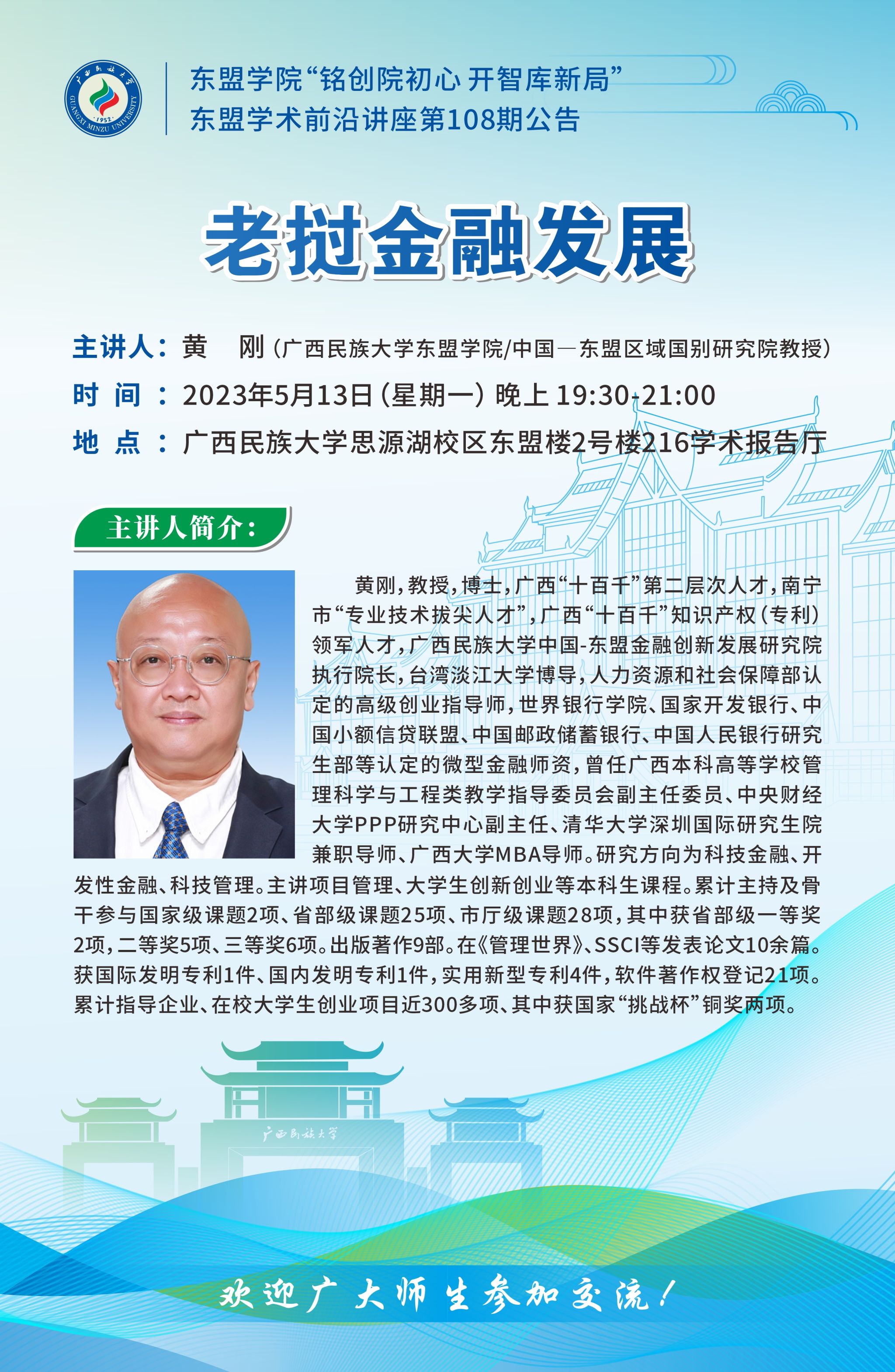 主 题:老挝金融发展 主讲人:黄刚(版权所有 英国·威廉希尔(WilliamHill)集团有限公司-官方网站/中国—东盟区域国别研究院教授) 时 间:2023年5月13日(星期一) 晚上 19:30—21:00 地 点:英国威廉公司官网思源湖校区东盟楼2号楼216学术报告厅 欢迎广大师生参加、交流! 英国威廉集团官网 中国—东盟区域国别研究院 2023年5月11日 主讲人简介: 黄刚,教授,博士,广西“十百千”第二层次人才,南宁市“专业技术拔尖人才”,广西“十百千”知识产权(专利)领军人才,英国威廉公司官网中国-东盟金融创新发展研究院执行经理,台湾淡江大学博导,人力资源和社会保障部认定的高级创业指导师,世界银行公司、国家开发银行、中国小额信贷联盟、中国邮政储蓄银行、中国人民银行研究生部等认定的微型金融团队,曾任广西本科高等公司管理科学与工程类教学指导委员会副主任委员、中央财经大学PPP研究中心副主任、清华大学深圳国际研究生院兼职导师、广西大学MBA导师。研究方向为科技金融、开发性金融、科技管理。主讲项目管理、老员工创新创业等本科生课程。累计主持及骨干参与国家级课题2项、省部级课题25项、市厅级课题28项,其中获省部级一等奖2项,二等奖5项、三等奖6项。出版著作9部。在《管理世界》、SSCI等发表论文10余篇。获国际发明专利1件、国内发明专利1件,实用新型专利4件,软件著作权登记21项。累计指导企业、在校老员工创业项目近300多项、其中获国家“挑战杯”铜奖两项。